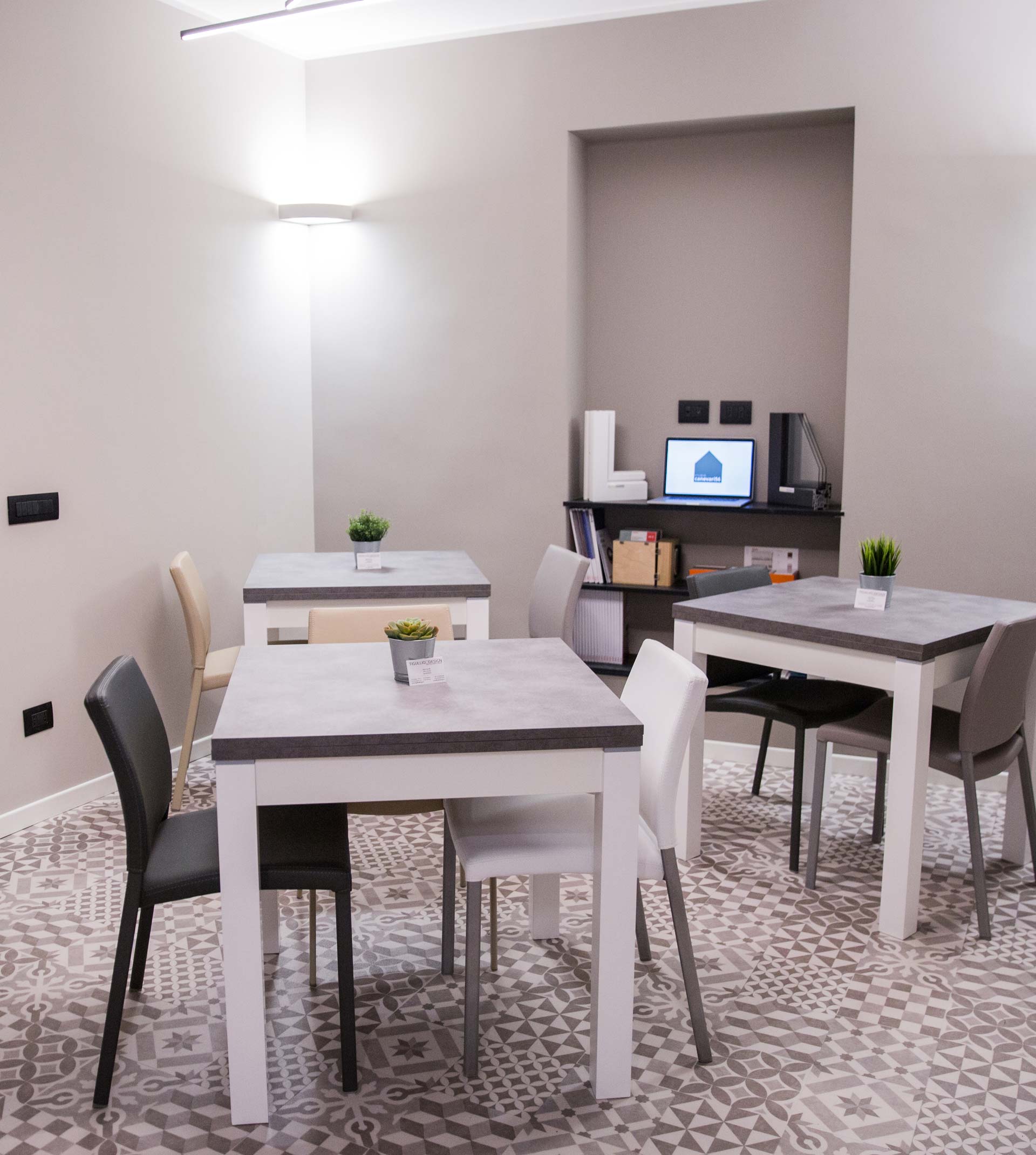 Lo show-room è dotato inoltre di uno spazio comune allestito come salotto di ricevimento per i visitatori, e di un’area esterna che unisce il fascino del giardino all’incanto del patio.